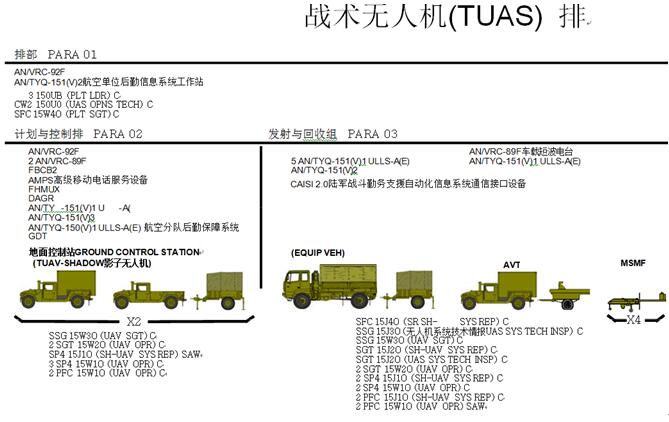 军事情报营由6个连组成。无人机系统(USA)连(参见图8),提供有组织的空中侦察与监视,运用影子无人机系统,与未来陆军大范围多用途无人机系统链接。技术收集连(参见图9),实施信号情报(SIGINT)活动,包括六个先知采集系统。收集与运用(C&E)连(参见图10)以及反情报连/人力情报连(参见图11),用于向高层指挥官提供反情报与人力情报收集任务,并加强或为旅战斗队或支援旅提供人力情报支援。其中,人力情报连拥有的夜视装备在全旅范围所占居多,用于夜间收集人工情报。